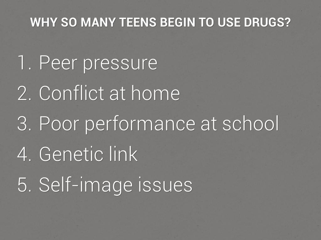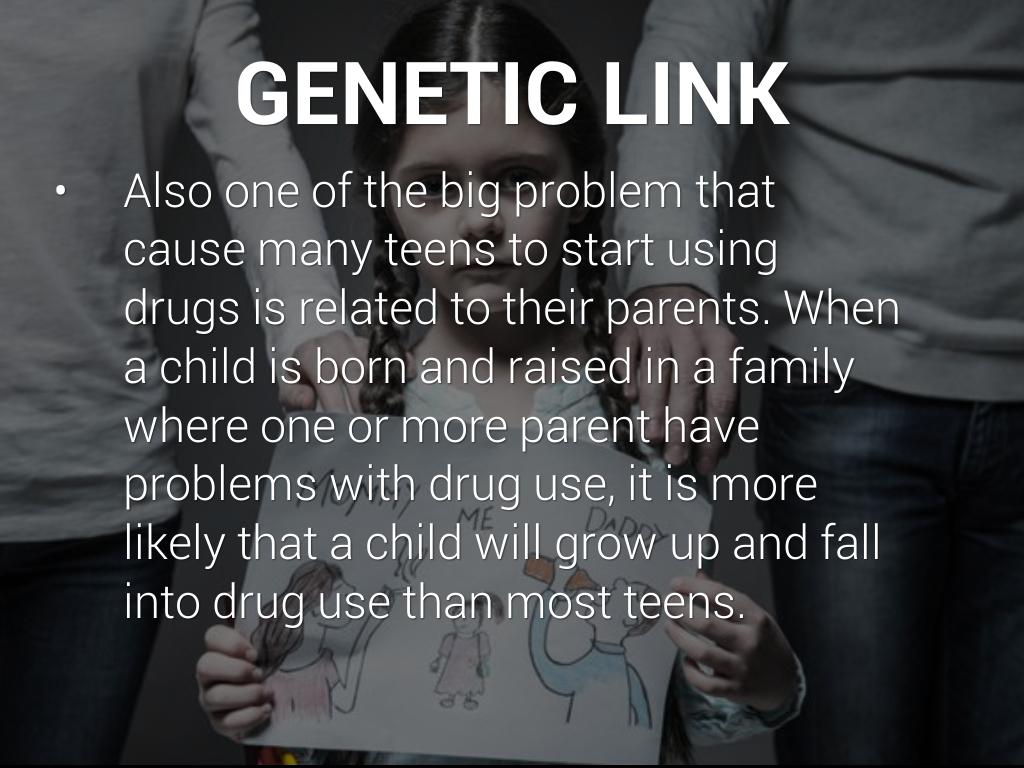 Also one of the big problem that cause many teens to start using drugs is related to their parents. When a child is born and raised in a family where one or more parent have problems with drug use, it is more likely that a child will grow up and fall into drug use than most teens.