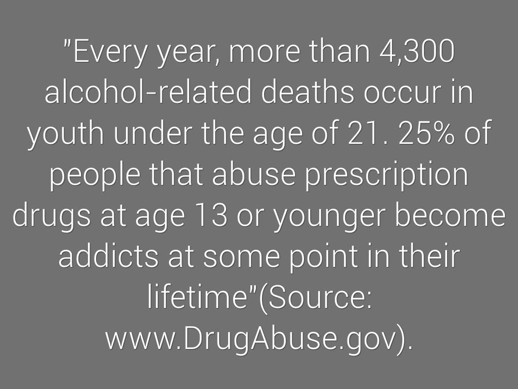 "Every year, more than 4,300 alcohol-related deaths occur in youth under the age of 21. 25% of people that abuse prescription drugs at age 13 or younger become addicts at some point in their lifetime"(Source: www.DrugAbuse.gov).