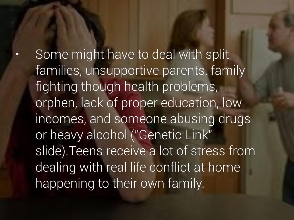 Some might have to deal with split families, unsupportive parents, family fighting though health problems, orphen, lack of proper education, low incomes, and someone abusing drugs or heavy alcohol ("Genetic Link" slide).Teens receive a lot of stress from dealing with real life conflict at home happening to their own family.