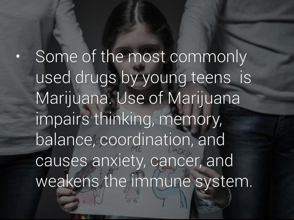 Some of the most commonly used drugs by young teens is Marijuana. Use of Marijuana impairs thinking, memory, balance, coordination, and causes anxiety, cancer, and weakens the immune system.