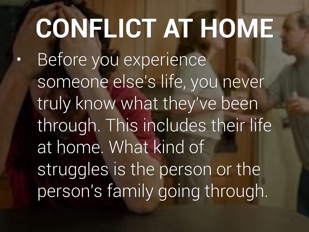 Before you experience someone else's life, you never truly know what they've been through. This includes their life at home. What kind of struggles is the person or the person's family going through.
