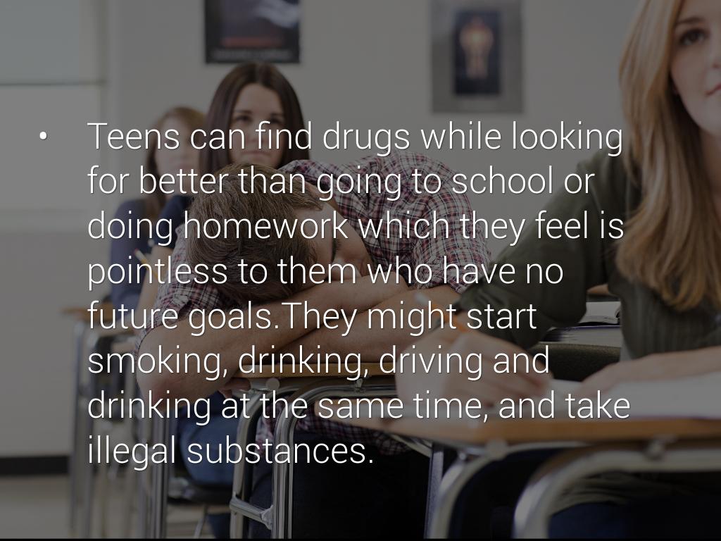 Teens can find drugs while looking for better than going to school or doing homework which they feel is pointless to them who have no future goals.They might start smoking, drinking, driving and drinking at the same time, and take illegal substances.