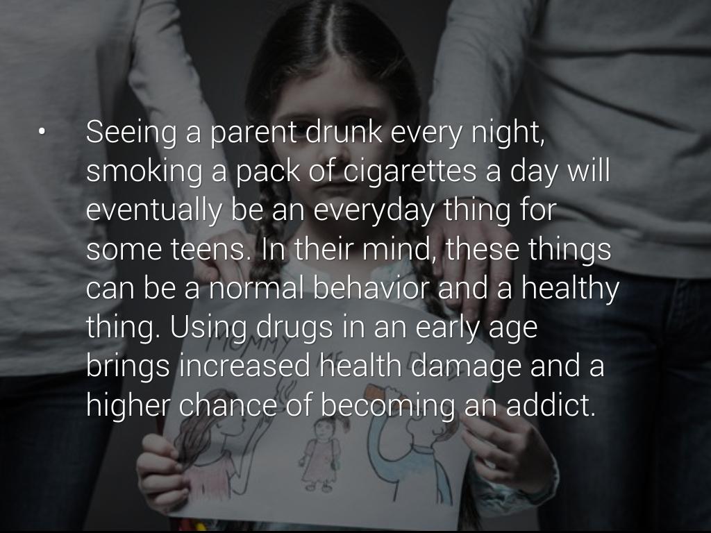 Seeing a parent drunk every night, smoking a pack of cigarettes a day will eventually be an everyday thing for some teens. In their mind, these things can be a normal behavior and a healthy thing. Using drugs in an early age brings increased health damage and a higher chance of becoming an addict.