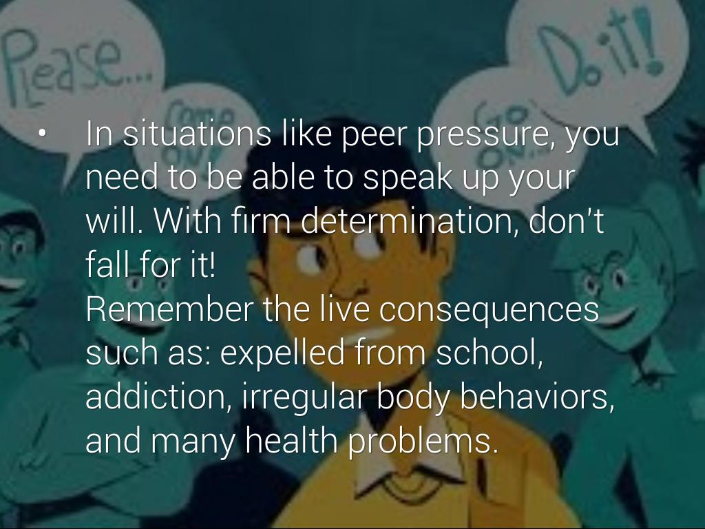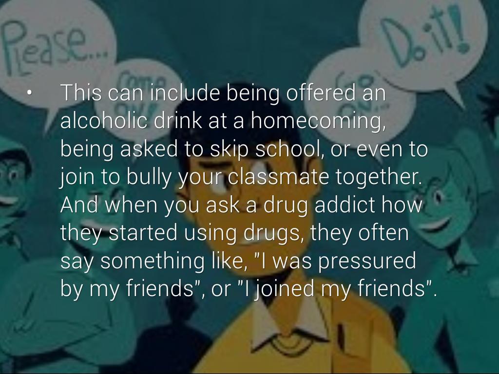 This can include being offered an alcoholic drink at a homecoming, being asked to skip school, or even to join to bully your classmate together. And when you ask a drug addict how they started using drugs, they often say something like, "I was pressured by my friends", or "I joined my friends".