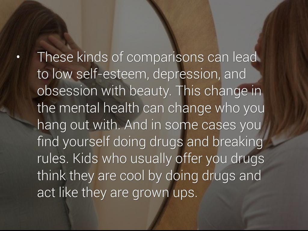 These kinds of comparisons can lead to low self-esteem, depression, and obsession with beauty. This change in the mental health can change who you hang out with. And in some cases you find yourself doing drugs and breaking rules. Kids who usually offer you drugs think they are cool by doing drugs and act like they are grown ups.