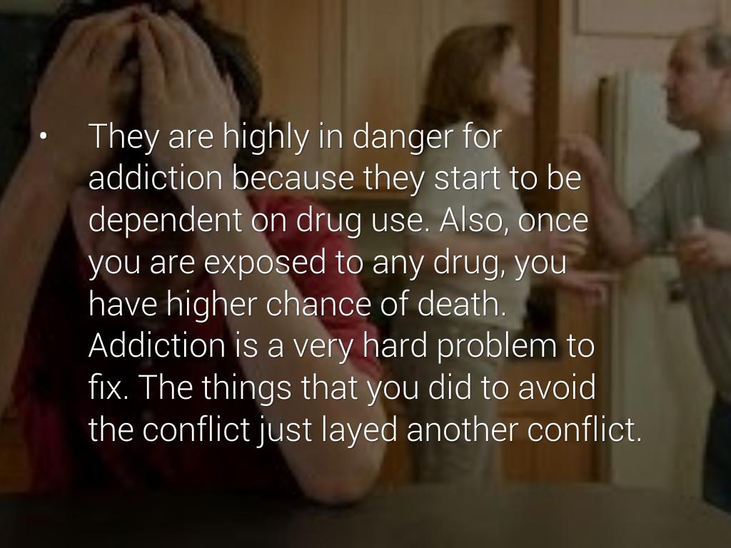 They are highly in danger for addiction because they start to be dependent on drug use. Also, once you are exposed to any drug, you have higher chance of death. Addiction is a very hard problem to fix. The things that you did to avoid the conflict just layed another conflict.