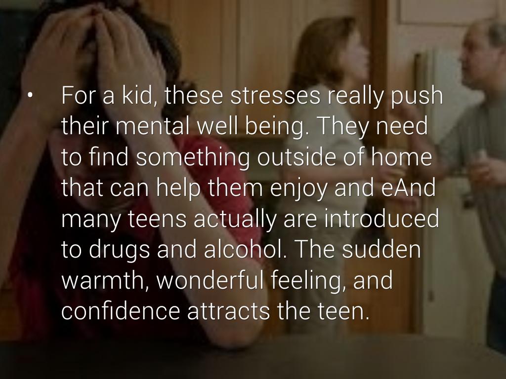 For a kid, these stresses really push their mental well being. They need to find something outside of home that can help them enjoy and eAnd many teens actually are introduced to drugs and alcohol. The sudden warmth, wonderful feeling, and confidence attracts the teen.
