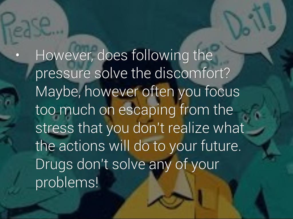 However, does following the pressure solve the discomfort? Maybe, however often you focus too much on escaping from the stress that you don't realize what the actions will do to your future. Drugs don't solve any of your problems!
