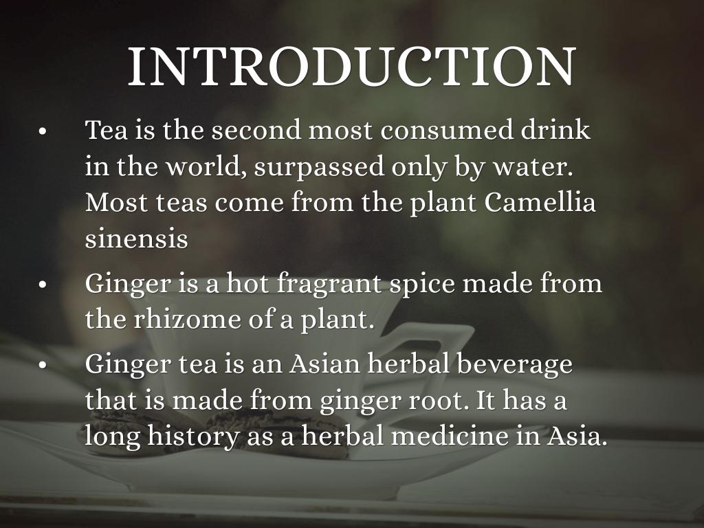 Ginger tea is an Asian herbal beverage that is made from ginger root. It has a long history as a herbal medicine in Asia.