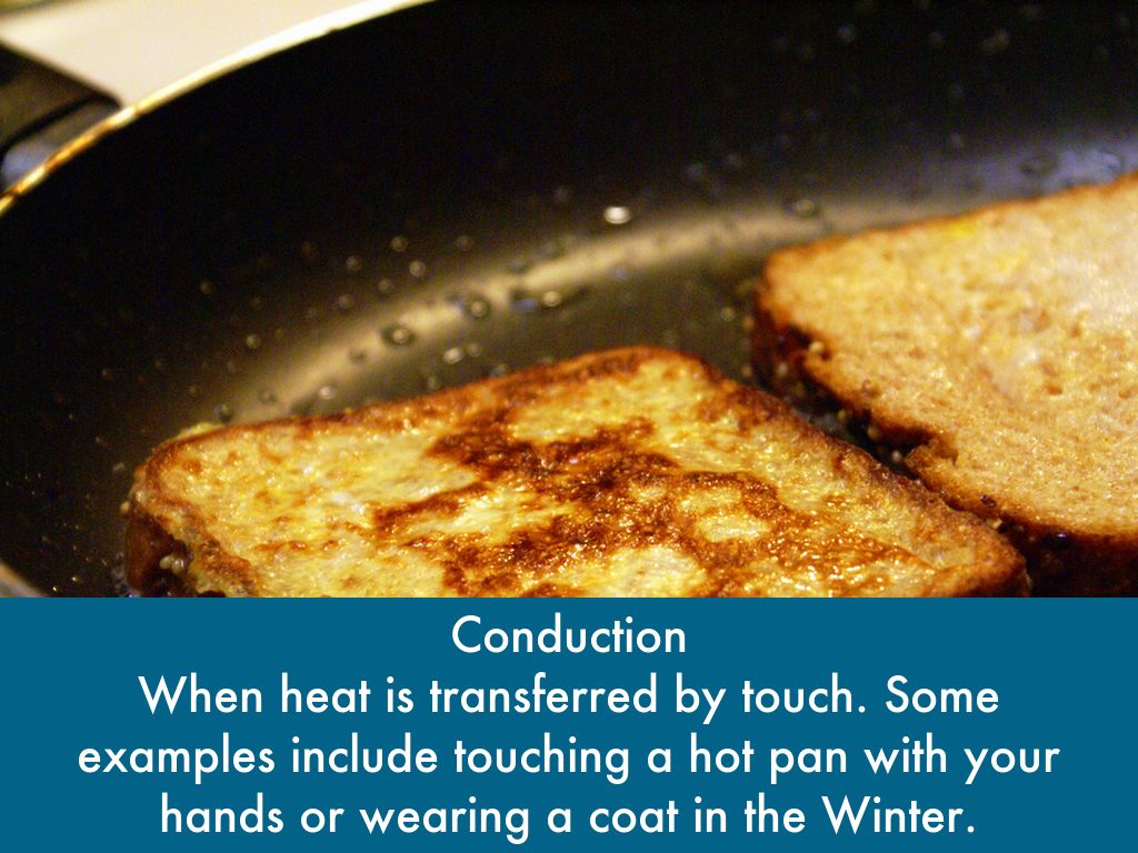 When heat is transferred by touch. Some examples include touching a hot pan with your hands or wearing a coat in the Winter.