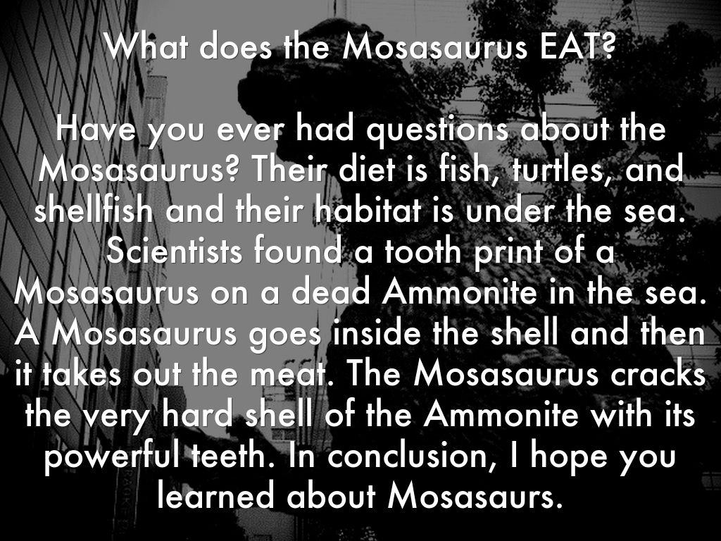 Have you ever had questions about the Mosasaurus? Their diet is fish, turtles, and shellfish and their habitat is under the sea. Scientists found a tooth print of a Mosasaurus on a dead Ammonite in the sea. A Mosasaurus goes inside the shell and then it takes out the meat. The Mosasaurus cracks the very hard shell of the Ammonite with its powerful teeth. In conclusion, I hope you learned about Mosasaurs.