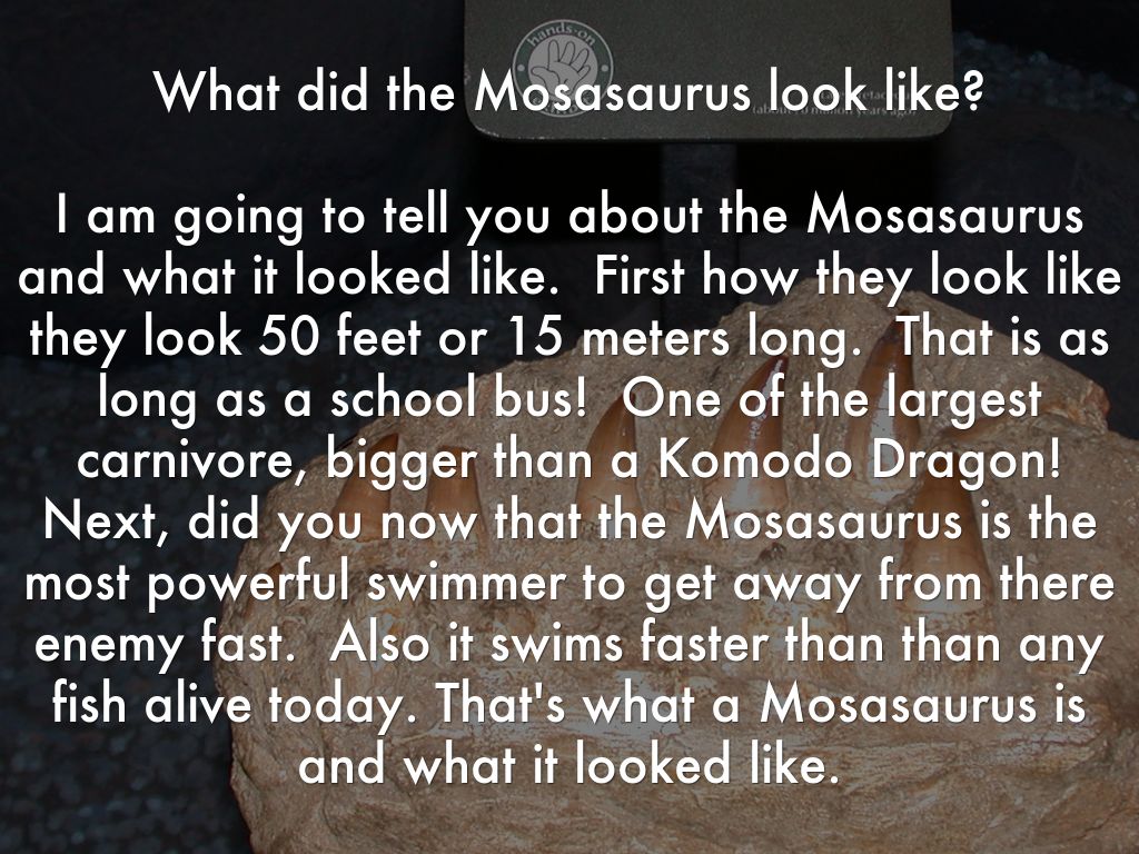 I am going to tell you about the Mosasaurus and what it looked like. First how they look like they look 50 feet or 15 meters long. That is as long as a school bus! One of the largest carnivore, bigger than a Komodo Dragon! Next, did you now that the Mosasaurus is the most powerful swimmer to get away from there enemy fast. Also it swims faster than than any fish alive today. That's what a Mosasaurus is and what it looked like.