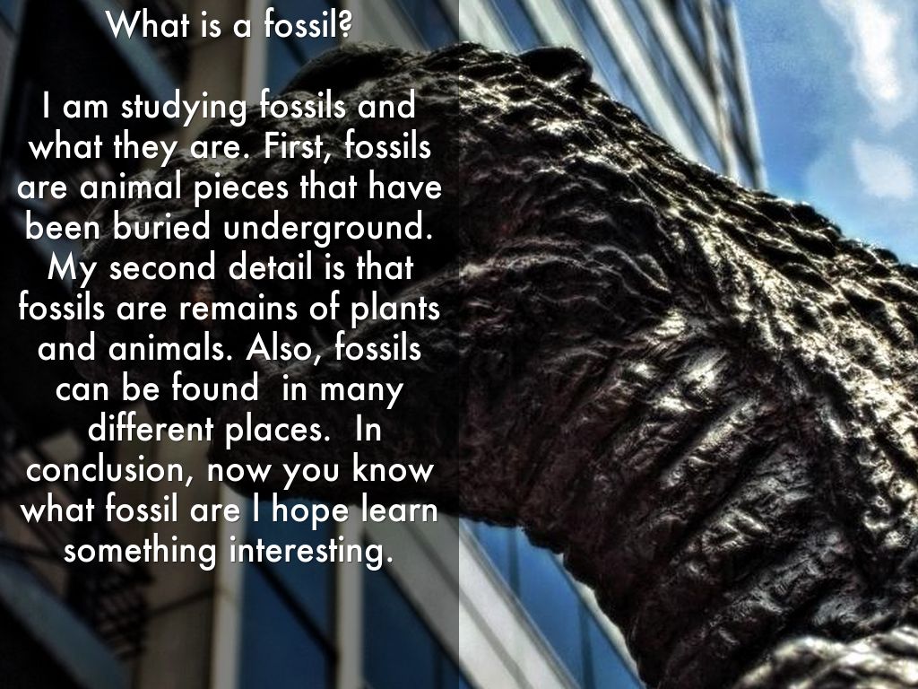 I am studying fossils and what they are. First, fossils are animal pieces that have been buried underground. My second detail is that fossils are remains of plants and animals. Also, fossils can be found in many different places. In conclusion, now you know what fossil are l hope learn something interesting.