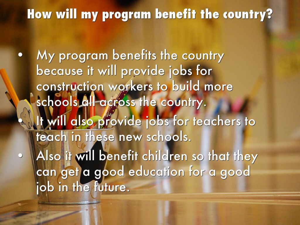 • My program benefits the country because it will provide jobs for construction workers to build more schools all across the country.