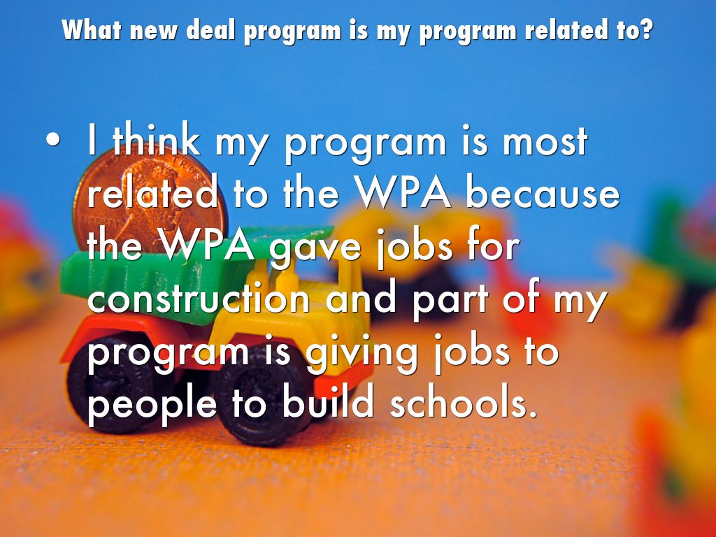 • I think my program is most related to the WPA because the WPA gave jobs for construction and part of my program is giving jobs to people to build schools.