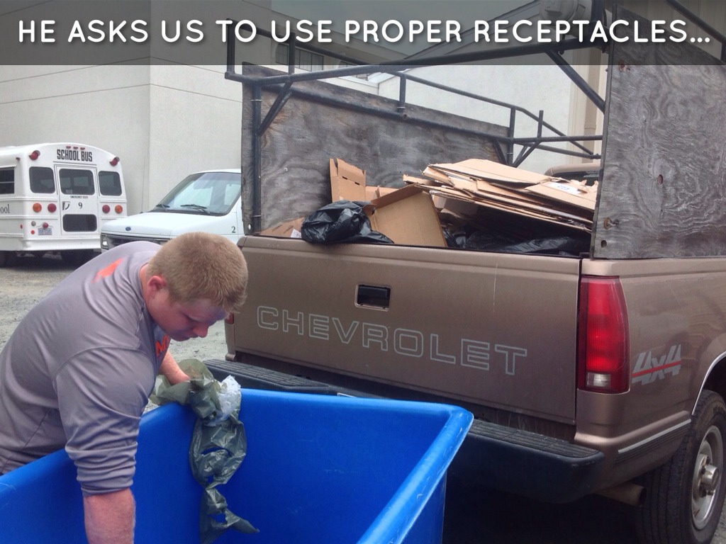 HE ASKS US TO USE PROPER RECEPTACLES...