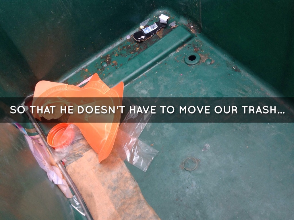 SO THAT HE DOESN'T HAVE TO MOVE OUR TRASH...