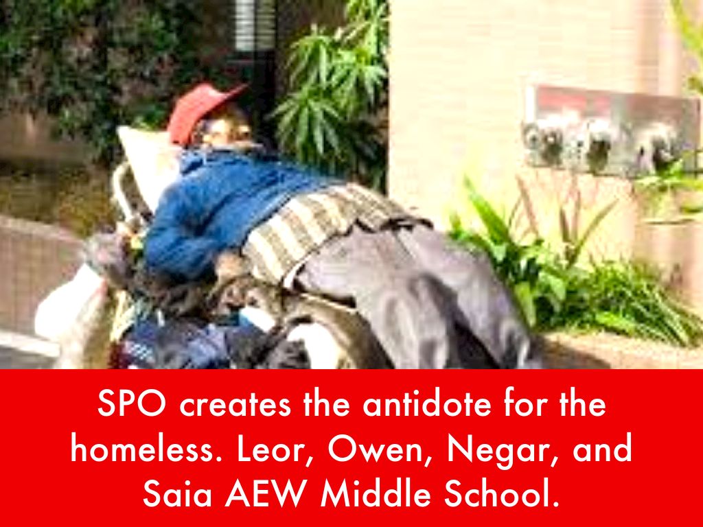 SPO creates the antidote for the homeless. Leor, Owen, Negar, and Saia AEW Middle School.