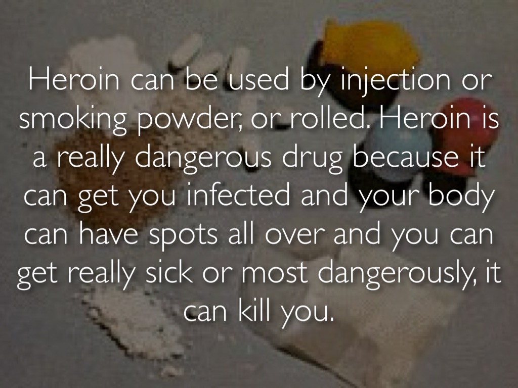 Heroin can be used by injection or smoking powder, or rolled. Heroin is a really dangerous drug because it can get you infected and your body can have spots all over and you can get really sick or most dangerously, it can kill you.