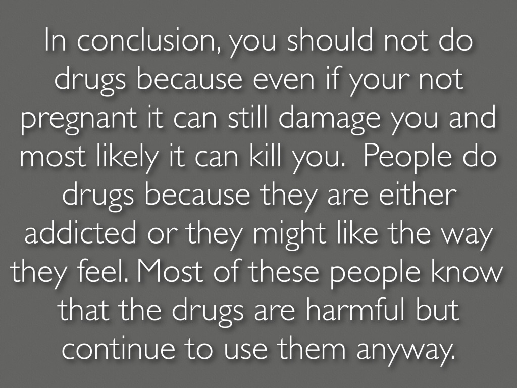 In conclusion, you should not do drugs because even if your not pregnant it can still damage you and most likely it can kill you. People do drugs because they are either addicted or they might like the way they feel. Most of these people know that the drugs are harmful but continue to use them anyway.