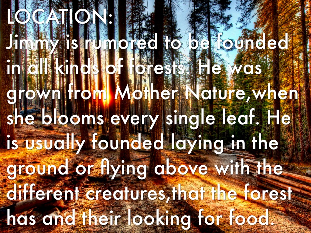 Jimmy is rumored to be founded in all kinds of forests. He was grown from Mother Nature,when she blooms every single leaf. He is usually founded laying in the ground or flying above with the different creatures,that the forest has and their looking for food.