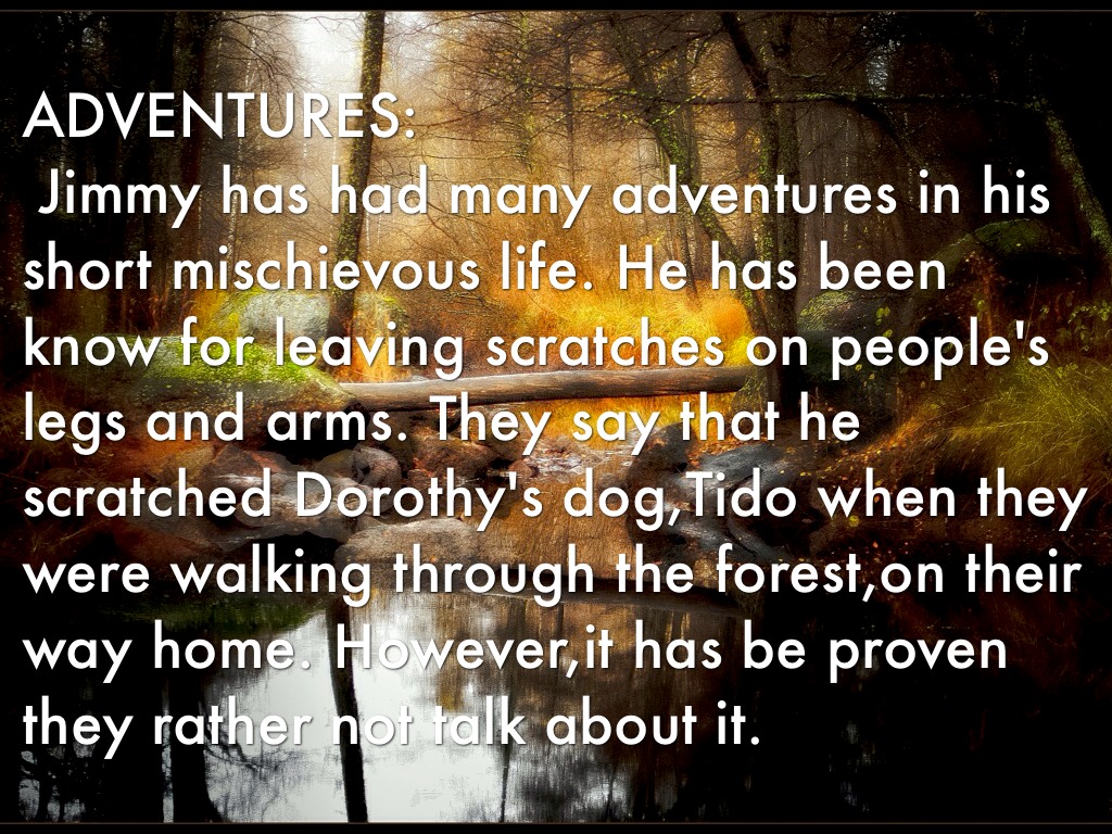 Jimmy has had many adventures in his short mischievous life. He has been know for leaving scratches on people's legs and arms. They say that he scratched Dorothy's dog,Tido when they were walking through the forest,on their way home. However,it has be proven they rather not talk about it.