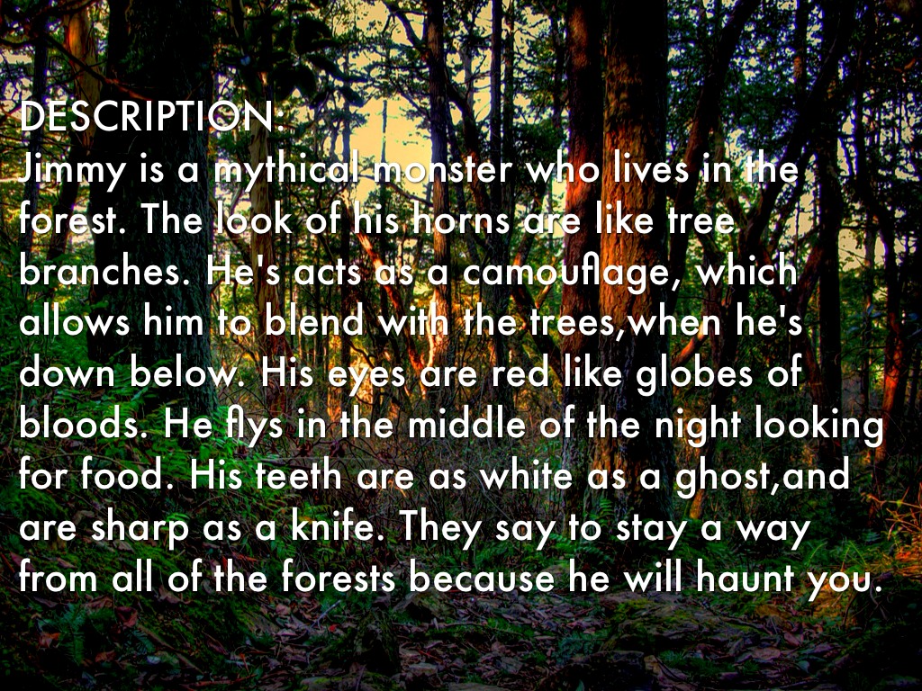 Jimmy is a mythical monster who lives in the forest. The look of his horns are like tree branches. He's acts as a camouflage, which allows him to blend with the trees,when he's down below. His eyes are red like globes of bloods. He flys in the middle of the night looking for food. His teeth are as white as a ghost,and are sharp as a knife. They say to stay a way from all of the forests because he will haunt you.