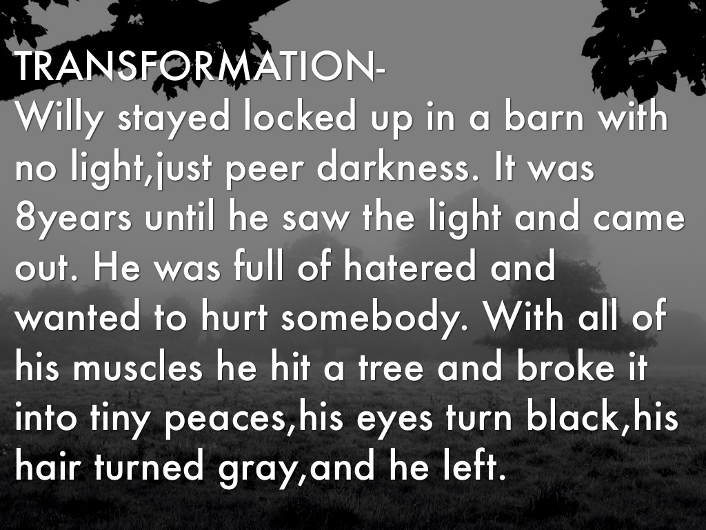 Willy stayed locked up in a barn with no light,just peer darkness. It was 8years until he saw the light and came out. He was full of hatered and wanted to hurt somebody. With all of his muscles he hit a tree and broke it into tiny peaces,his eyes turn black,his hair turned gray,and he left.