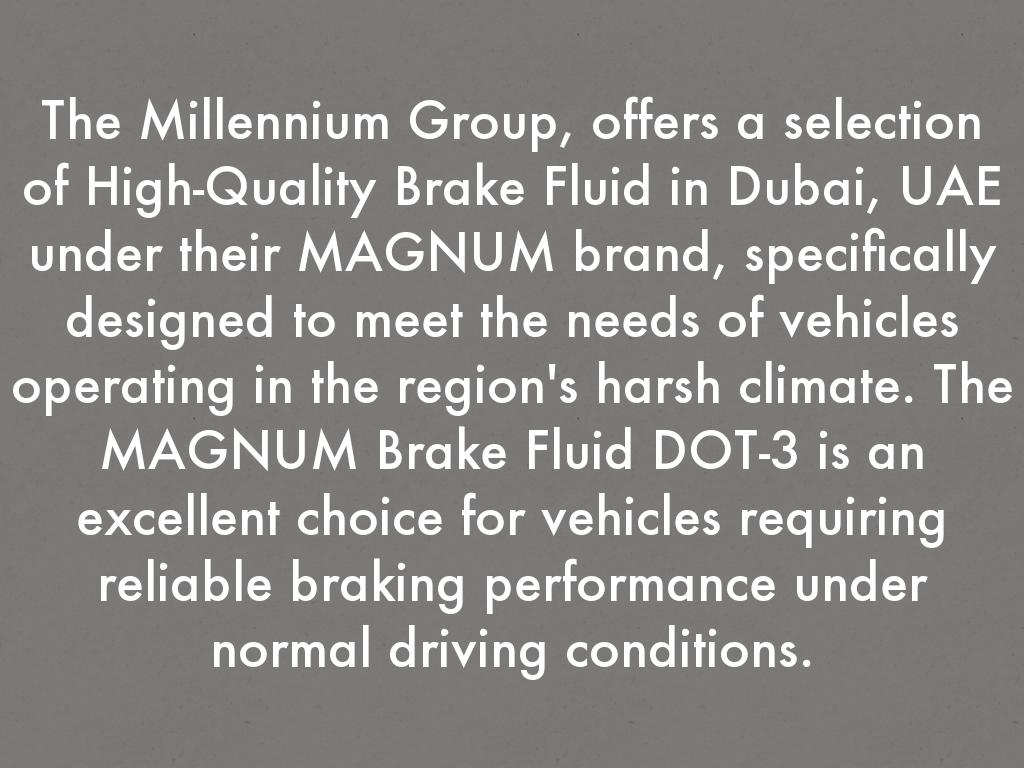 In Dubai, UAE, the demand for high-quality brake fluid is crucial due to the region's extreme temperatures and rigorous driving conditions. The Millennium Group supplies high-quality brake fluids, ensuring that automotive and industrial vehicles in Dubai operate with maximum efficiency and safety. More info :