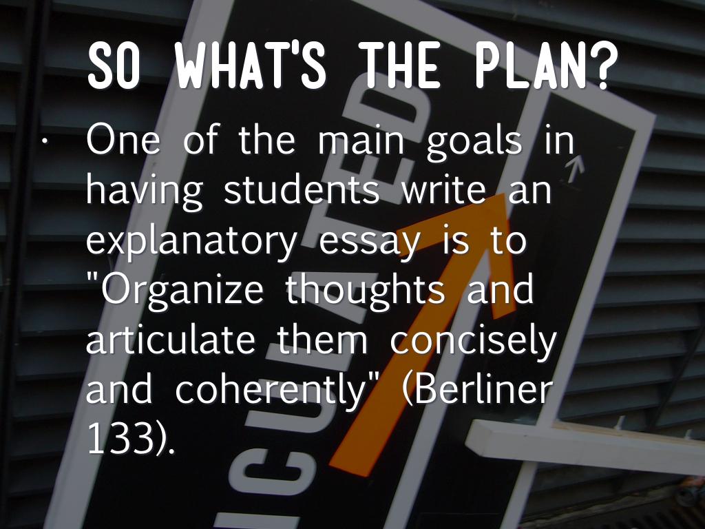 One of the main goals in having students write an explanatory essay is to "Organize thoughts and articulate them concisely and coherently" (Berliner 133).