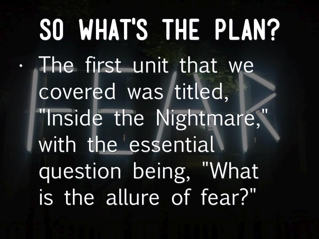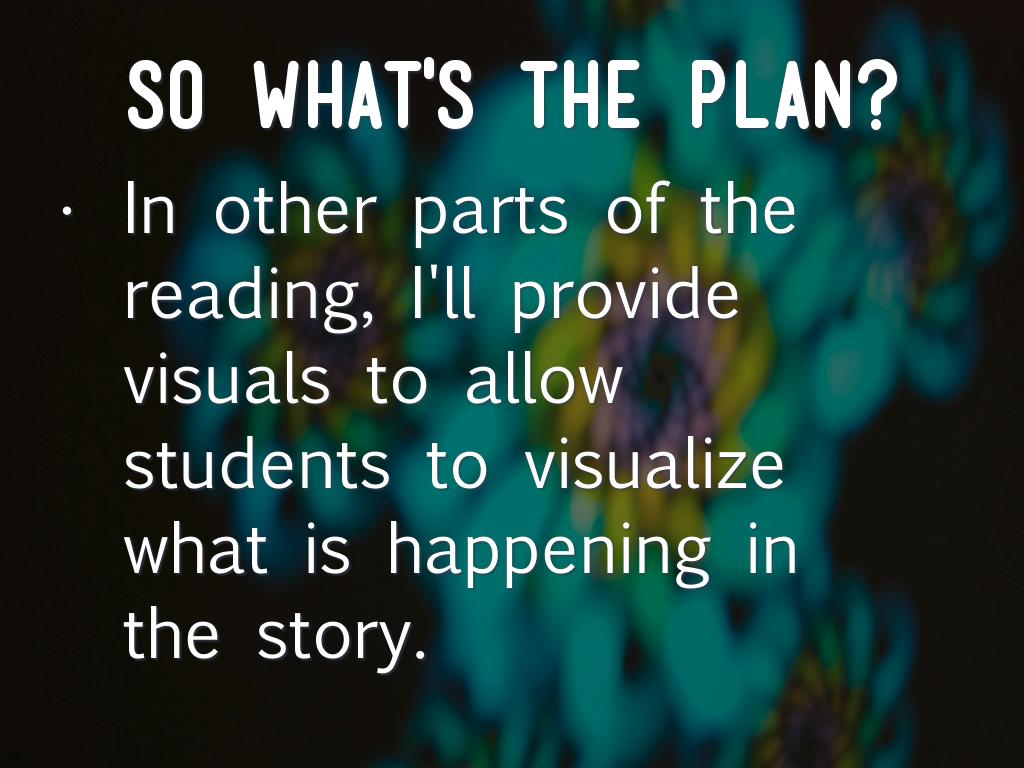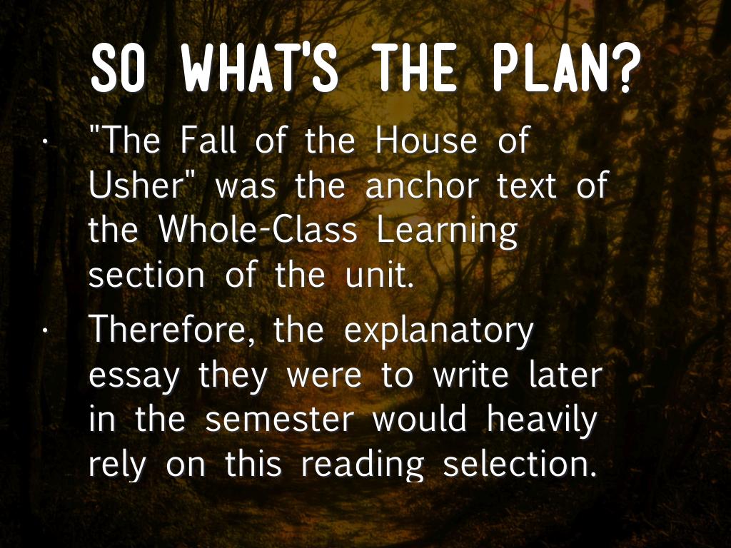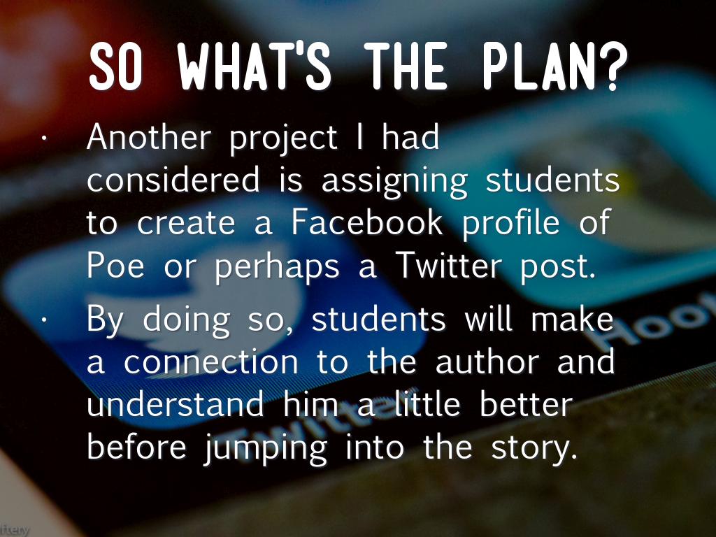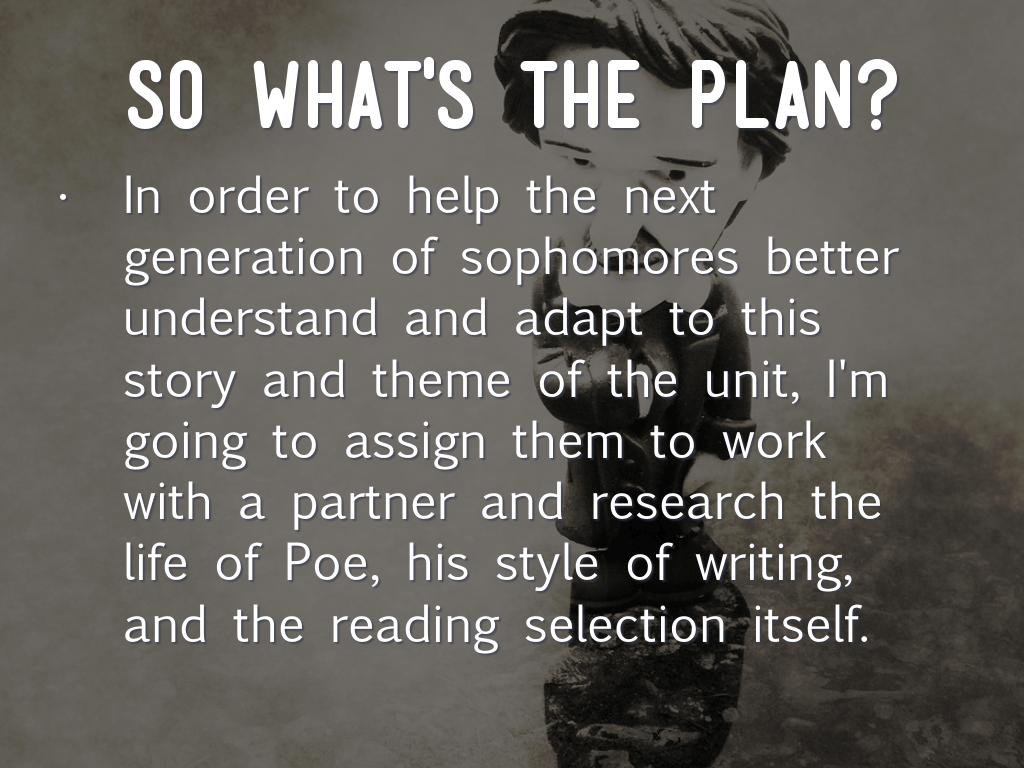 In order to help the next generation of sophomores better understand and adapt to this story and theme of the unit, I'm going to assign them to work with a partner and research the life of Poe, his style of writing, and the reading selection itself.