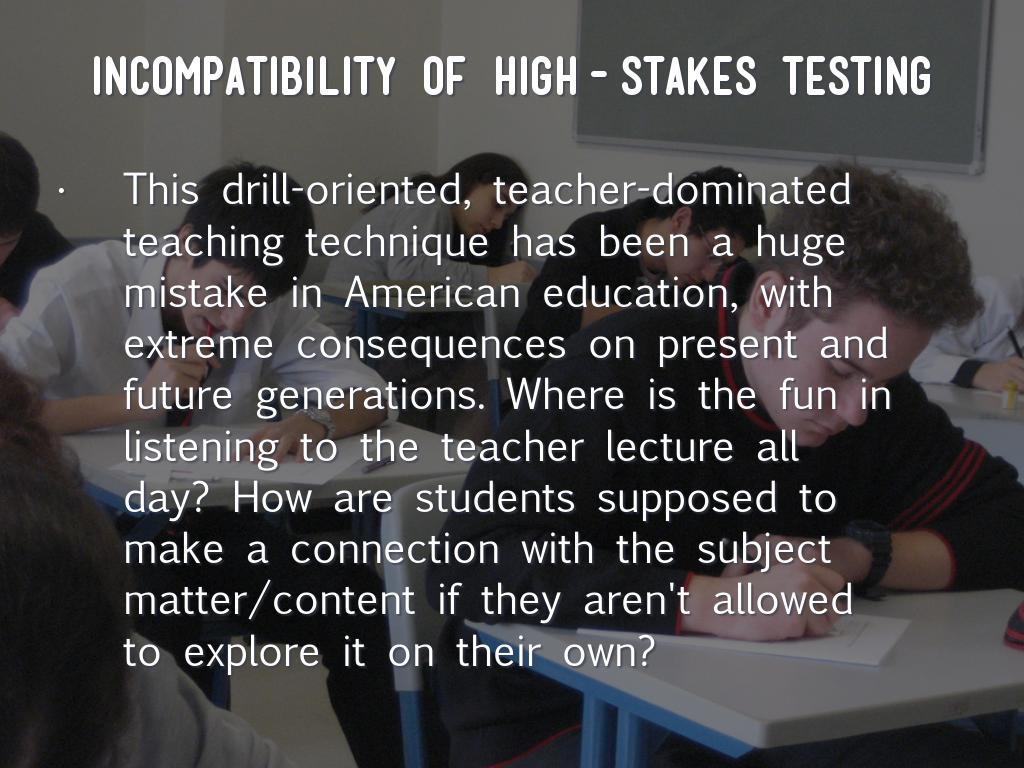 This drill-oriented, teacher-dominated teaching technique has been a huge mistake in American education, with extreme consequences on present and future generations. Where is the fun in listening to the teacher lecture all day? How are students supposed to make a connection with the subject matter/content if they aren't allowed to explore it on their own?