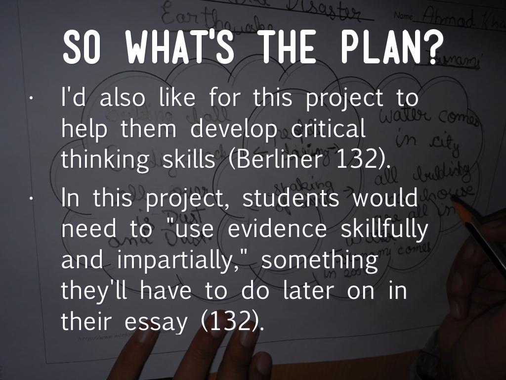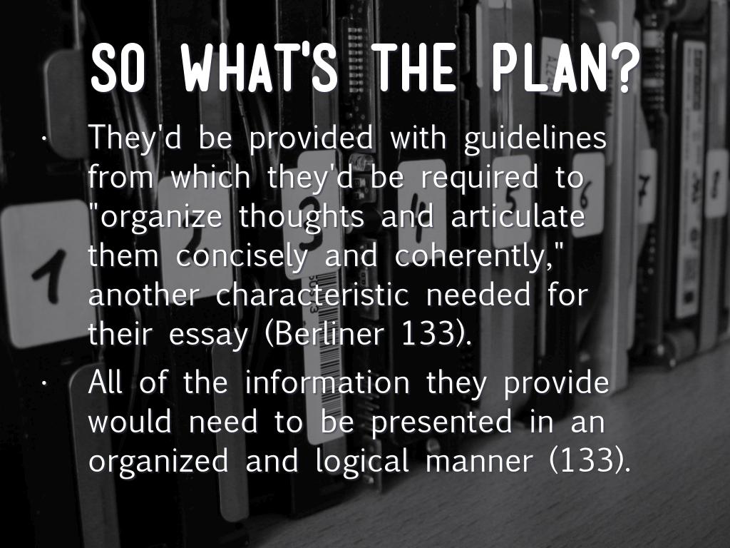 They'd be provided with guidelines from which they'd be required to "organize thoughts and articulate them concisely and coherently," another characteristic needed for their essay (Berliner 133).
