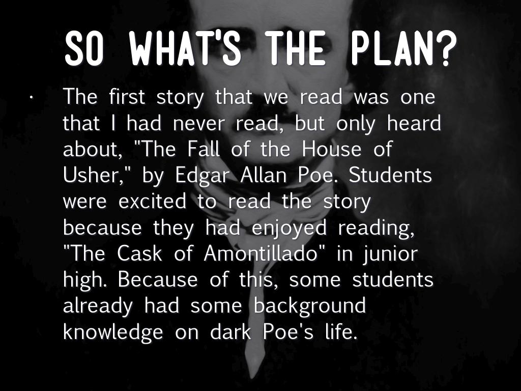 The first story that we read was one that I had never read, but only heard about, "The Fall of the House of Usher," by Edgar Allan Poe. Students were excited to read the story because they had enjoyed reading, "The Cask of Amontillado" in junior high. Because of this, some students already had some background knowledge on dark Poe's life.