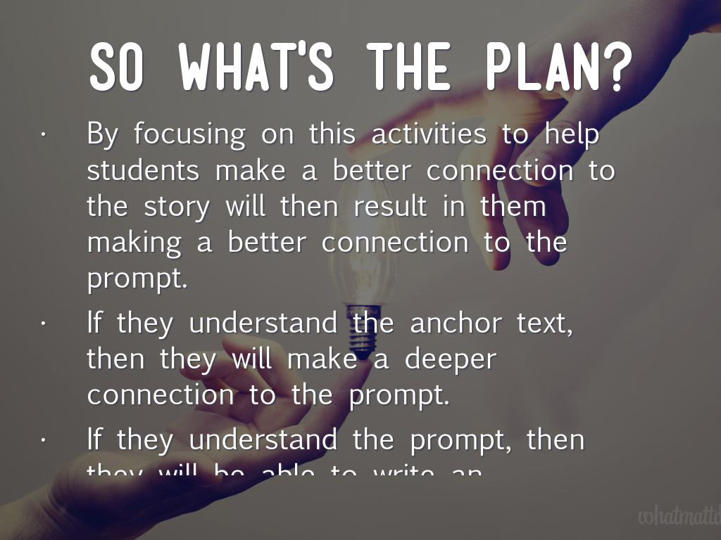 By focusing on this activities to help students make a better connection to the story will then result in them making a better connection to the prompt.