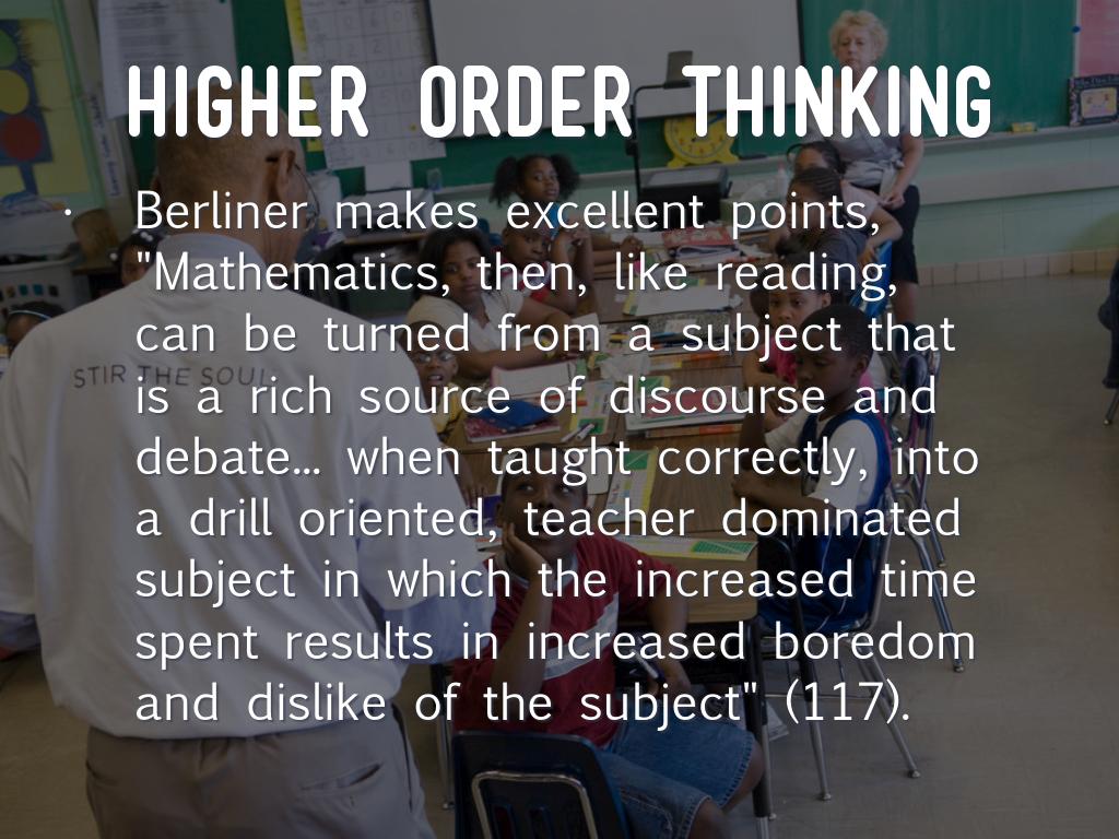 Berliner makes excellent points, "Mathematics, then, like reading, can be turned from a subject that is a rich source of discourse and debate... when taught correctly, into a drill oriented, teacher dominated subject in which the increased time spent results in increased boredom and dislike of the subject" (117).