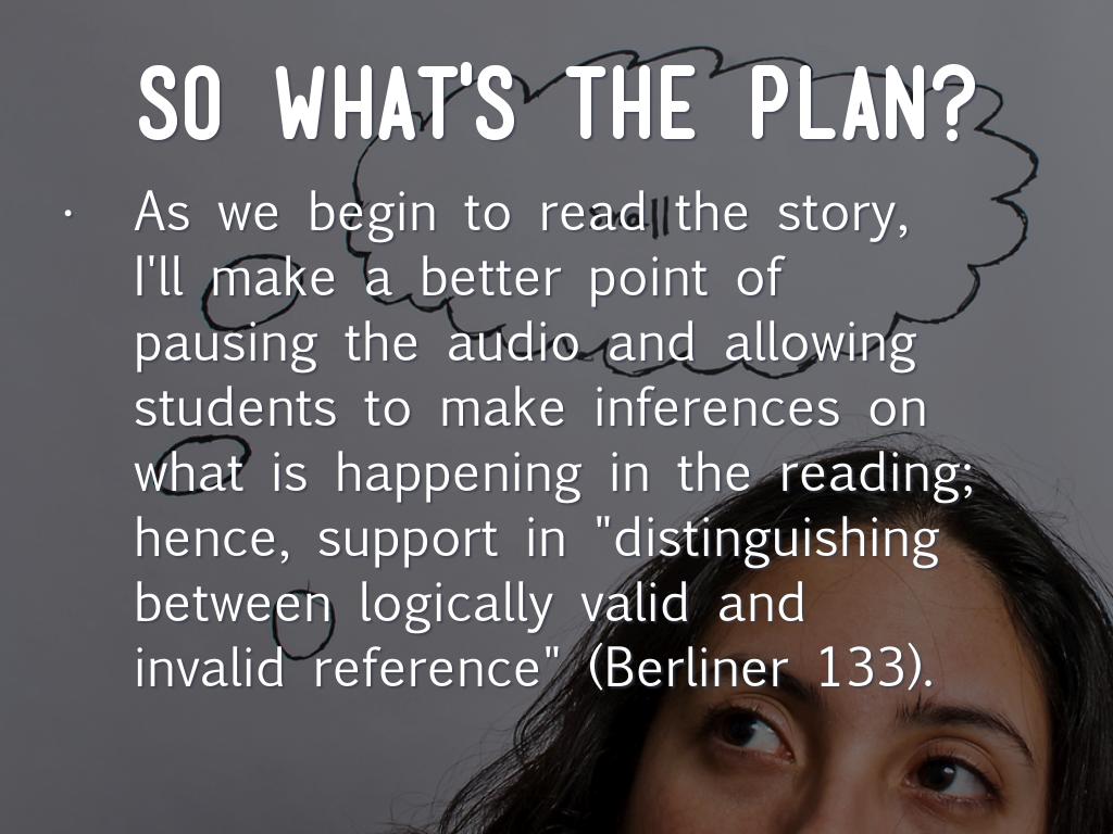 As we begin to read the story, I'll make a better point of pausing the audio and allowing students to make inferences on what is happening in the reading; hence, support in "distinguishing between logically valid and invalid reference" (Berliner 133).