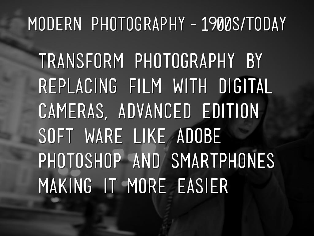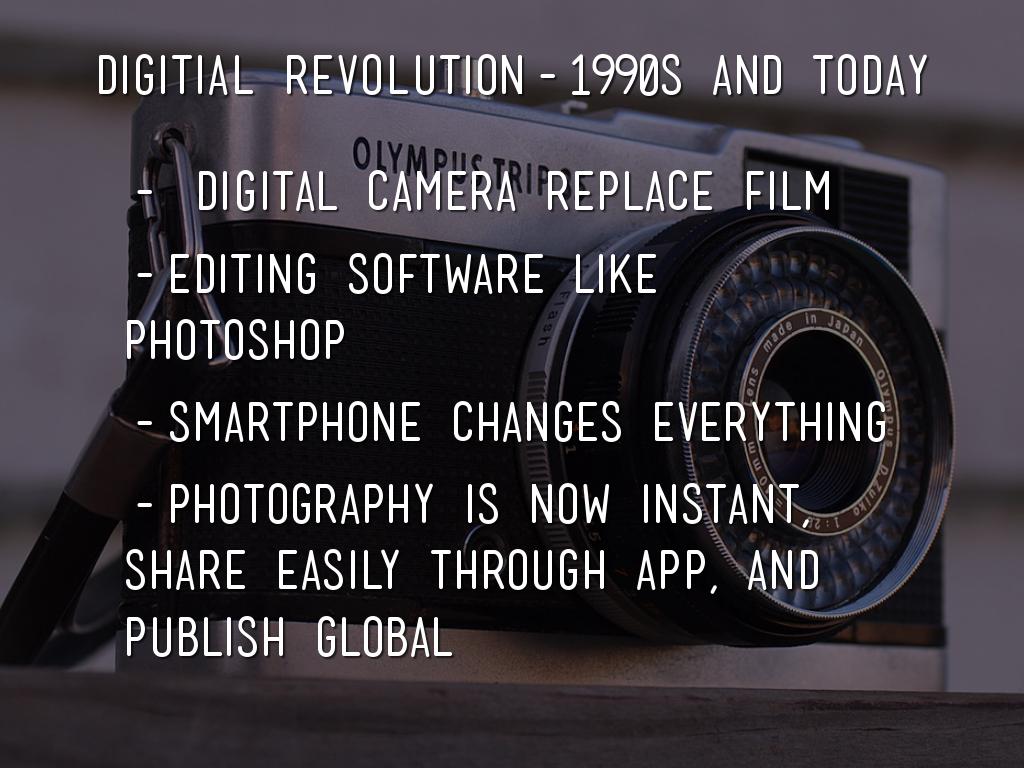 transform photography by replacing film with digital cameras, advanced edition soft ware like Adobe photoshop and smartphones making it more easier