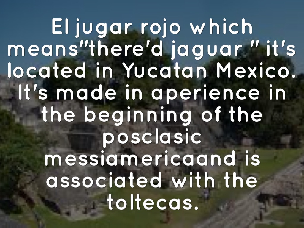 El jugar rojo which means"there'd jaguar " it's located in Yucatan Mexico. It's made in aperience in the beginning of the posclasic messiamericaand is associated with the toltecas.