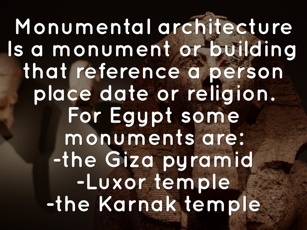 Monumental architecture Is a monument or building that reference a person place date or religion. For Egypt some monuments are: -the Giza pyramid -Luxor temple -the Karnak temple