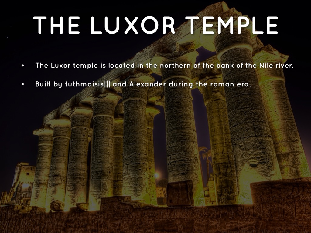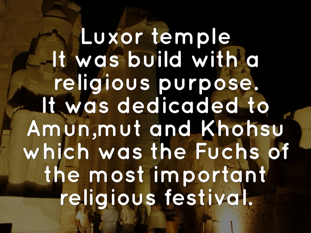Luxor temple It was build with a religious purpose. It was dedicaded to Amun,mut and Khohsu which was the Fuchs of the most important religious festival.