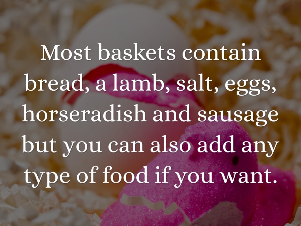Most baskets contain bread, a lamb, salt, eggs, horseradish and sausage but you can also add any type of food if you want.