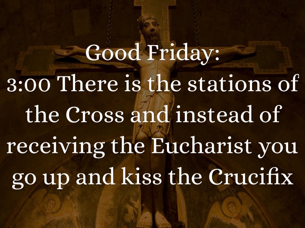3:00 There is the stations of the Cross and instead of receiving the Eucharist you go up and kiss the Crucifix