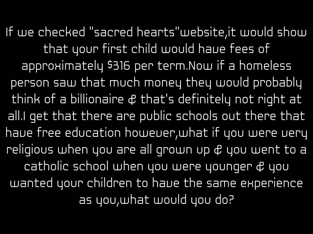 If we checked "sacred hearts"website,it would show that your first child would have fees of approximately $316 per term.Now if a homeless person saw that much money they would probably think of a billionaire & that's definitely not right at all.I get that there are public schools out there that have free education however,what if you were very religious when you are all grown up & you went to a catholic school when you were younger & you wanted your children to have the same experience as you,what would you do?