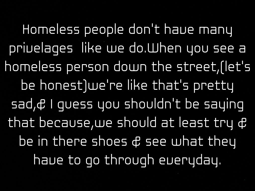 Homeless people don't have many privelages like we do.When you see a homeless person down the street,(let's be honest)we're like that's pretty sad,& I guess you shouldn't be saying that because,we should at least try & be in there shoes & see what they have to go through everyday.