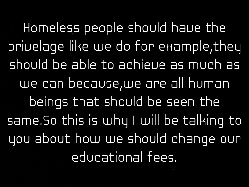 Homeless people should have the privelage like we do for example,they should be able to achieve as much as we can because,we are all human beings that should be seen the same.So this is why I will be talking to you about how we should change our educational fees.