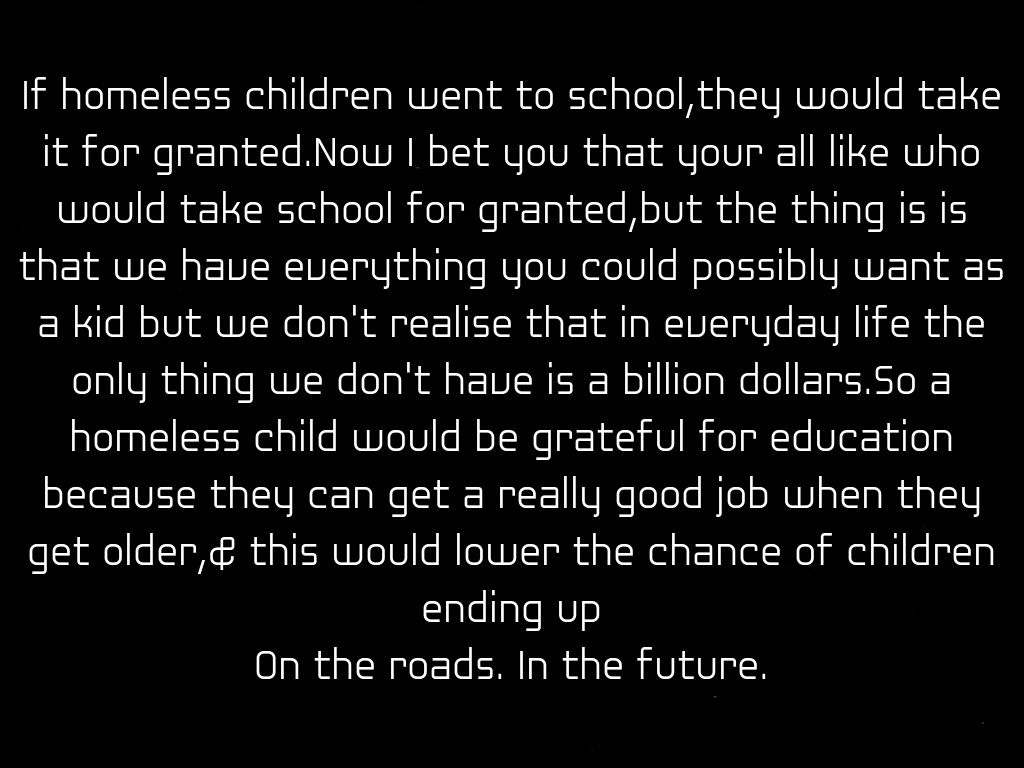 If homeless children went to school,they would take it for granted.Now I bet you that your all like who would take school for granted,but the thing is is that we have everything you could possibly want as a kid but we don't realise that in everyday life the only thing we don't have is a billion dollars.So a homeless child would be grateful for education because they can get a really good job when they get older,& this would lower the chance of children ending up On the roads. In the future.