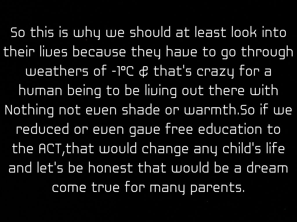 So this is why we should at least look into their lives because they have to go through weathers of -1°C & that's crazy for a human being to be living out there with Nothing not even shade or warmth.So if we reduced or even gave free education to the ACT,that would change any child's life and let's be honest that would be a dream come true for many parents.