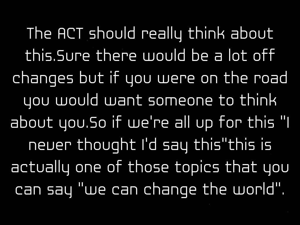 The ACT should really think about this.Sure there would be a lot off changes but if you were on the road you would want someone to think about you.So if we're all up for this "I never thought I'd say this"this is actually one of those topics that you can say "we can change the world".