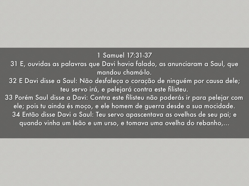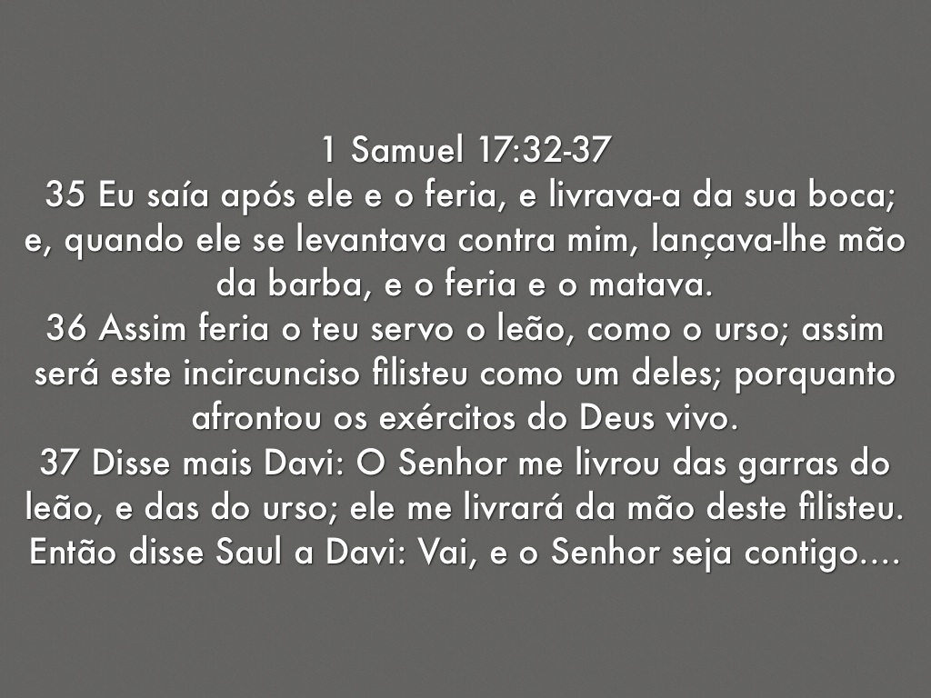 37 Disse mais Davi: O Senhor me livrou das garras do leão, e das do urso; ele me livrará da mão deste filisteu. Então disse Saul a Davi: Vai, e o Senhor seja contigo.